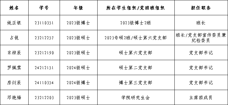 根据《党委学生工作部关于开展2024-2025学年研究生优秀学生干部评选工作的通知》(学生〔2025〕447号),经本人申请、学院评定工作小组评定,现公示我院2024-2025学年研究生优秀学生干部推荐名单,具体如下: