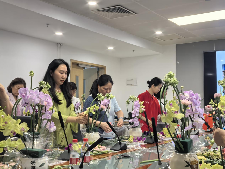 本次花艺活动以“专业指导+实践创作”为核心,特邀资深花艺师现场授课。活动选取蝴蝶兰、玫瑰、洋桔梗、尤加利叶等春日花材,结合“色彩搭配”与“空间构图”,引导教职工在插花过程中感受“花与艺、心与美”的融合。活动现场,花艺师首先讲解花材的寓意与养护技巧,从“主花与配叶的搭配”到“高低错落的层次感”,将专业知识与审美理念娓娓道来。随后,教职工们开始动手实践,修剪枝叶、搭配花材、调整造型,指尖翻飞间,一盆盆兼具“个人风格”与“艺术美感”的花艺作品逐渐成型。
