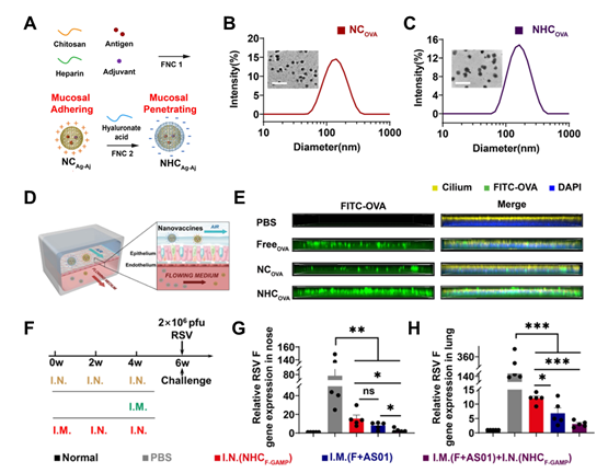 D, E 纳米疫苗的黏膜屏障穿透能力在人器官芯片上的评价。F, G, H 纳米疫苗在小鼠上的保护作用